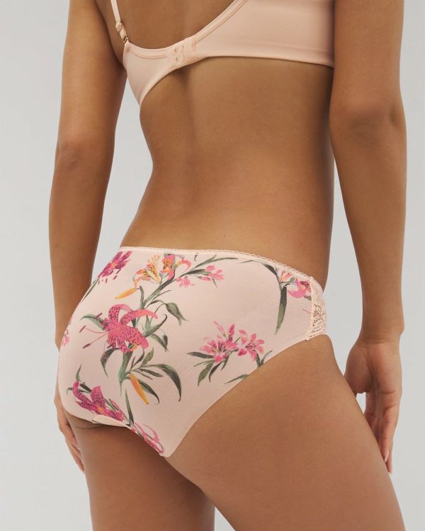 Beautiful lace-enhanced hipster has patented silicone edges that eliminate ride up and are invisible under clothes. Panty stays right where you want it without panty lines.