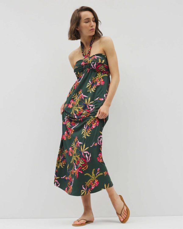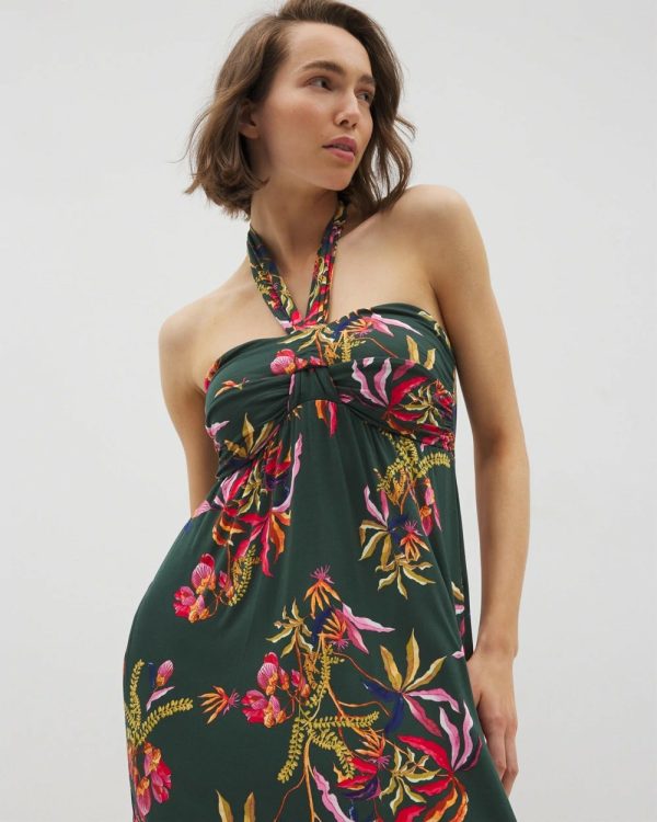 Escape in a dress made of soft jersey material with a built-in shelf bra— keeping you carefree wherever your plans take you. The tie neck gives you all the styling options including halter + strapless.
