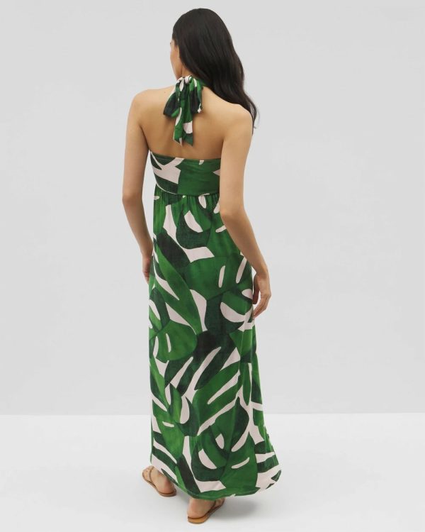 Escape in a dress made of soft jersey material with a built-in shelf bra— keeping you carefree wherever your plans take you. The tie neck gives you all the styling options including halter + strapless.