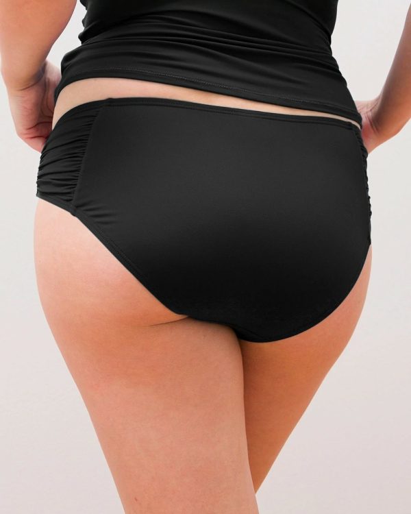Ruched sides add a flattering design detail to these bikini swim bottoms. Mix and match them with your favorite bikini or tankini top and make a fashionable splash this summer.